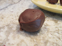 Take the dough out and melt the chocolate. I would recommend melting in a double boiler but you could also use the microwave. Use two forks to dip in the truffles, take them out, and place back on the wax paper.