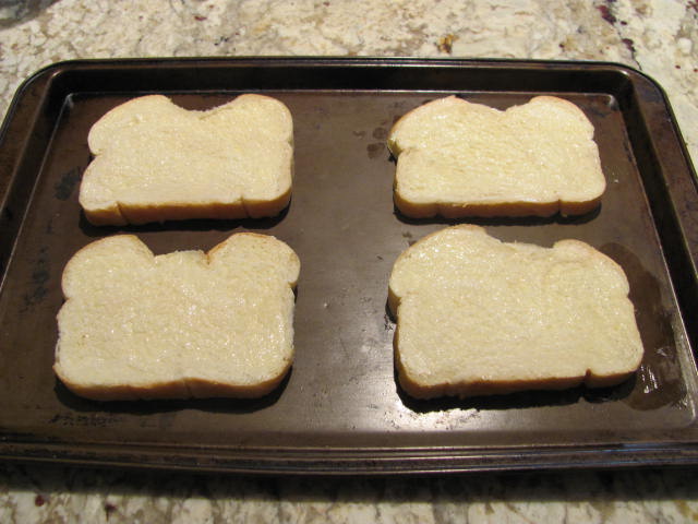 Lay the bread out on a cookie sheet and toast in the oven for about 6 minutes. Meanwhile, melt 1 tablespoon of butter in a saucepan over medium to low heat. Add the flour and stir for about 1 minute. Pour in the milk and whisk until the sauce is thickened. Turn off the heat and stir in 1/4 cup of the shredded cheese until it is melted. Salt and pepper the sauce to taste.
