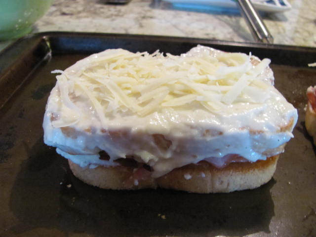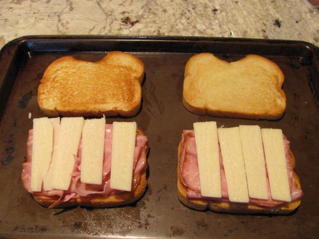 To assemble the sandwiches, top two bread slices with the ham and sliced Gruyere.